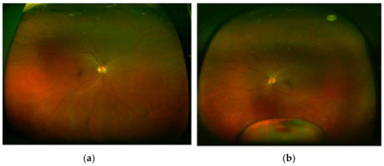 Optos pseudocolor ultra-widefield fundus photograph of right eye (a) and left eye (b) showing lens dislocation in vitreous cavity.