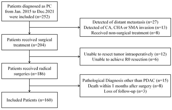 Flowchart of patient screening (PC: pancreatic cancer; CA: celiac axis; CHA: common hepatic artery; SMA: superior mesenteric artery; PDAC: pancreatic ductal adenocarcinoma).