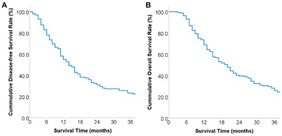 Long-term prognosis of patients: (A) overall disease-free survival curve of included patients; (B) overall survival curve of included patients.