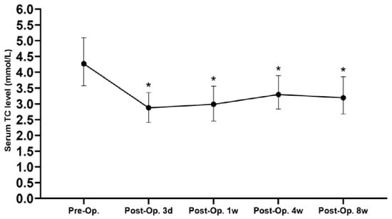 The variation tendency of serum TC perioperatively (*: compared with preoperative TC, p < 0.05, TC: total cholesterol, Preop.: preoperation, Postop.: postoperation).