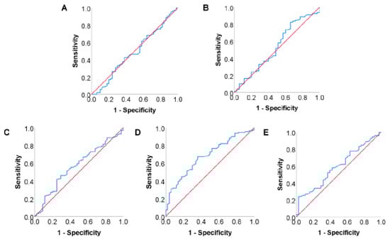 ROC curves between serum TC level at different time points and 1-year survival rate: (A) ROC curve between preoperative serum TC level and 1-year survival rate; (B) ROC curve between postoperative 3-day serum TC level and 1-year survival rate; (C) ROC curve between postoperative 1-week serum TC level and 1-year survival rate; (D) ROC curve between postoperative 4-week serum TC level and 1-year survival rate; (E) ROC curve between postoperative 8-week serum TC level and 1-year survival rate.