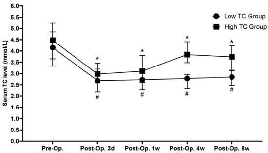 Variation in serum TC in the low-TC group and high-TC group perioperatively (*: compared with preoperative serum TC in the high-TC group, p < 0.05, #: compared with preoperative serum TC in the low-TC group, p < 0.05, TC: total cholesterol, Preop.: preoperation, Postop.: postoperation).