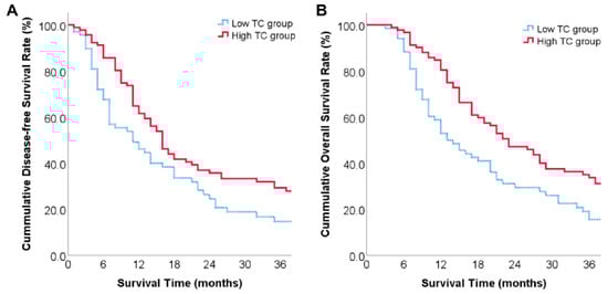 The median DFS of patients in the low-TC and high-TC groups was 11 months and 16 months, respectively, and DFS rates at 1, 2 and 3 years after surgery were 46.1%, 24.5%, 14.7% and 61.6%, and 35.8% and 29.3%, respectively (p = 0.041, Figure 6A). The median OS of patients in the low-TC group and high-TC group was 13 months and 23 months, respectively, and the OS rate at 1, 2, and 3 years after surgery was 52.9% and 29.4%, 15.6% and 80.4%, and 47.2% and 33.8%, respectively (p = 0.005, Figure 6B).