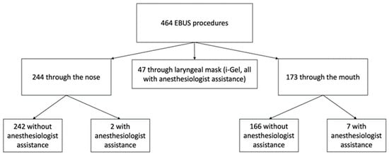 Between January 2020 and December 2021, 464 eligible patients underwent a linear EBUS at our center; 244 (52.6%) procedures have been performed via the nasal route and 173 (36.3%) via the oral route; of these procedures, respectively, 2 (0.4% of the total) and 7 (1.5%) have been performed with anesthesiologist assistance. The remaining 47 procedures (10.1%) have been performed via laryngeal mask (i-gel), all under anesthesiologist assistance. The division of the casuistry is shown in Figure 2.
