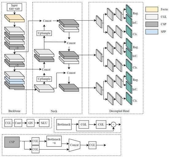 The network structure of the improved YOLOX is shown in Figure 4. The model network architecture consists of three main components: the backbone, neck, and decoupled head. The backbone network is responsible for extracting image features and comprises cross-stage partial connections (CSP), spatially separable convolution (SSP), bottleneck modules, and focus modules [18]. The CGL module is the smallest component in the network architecture of YOLOX. It is composed of convolution operations, GN, and SiLU activation functions. The detailed structure of the SPP and focus modules is shown in Figure A1 in the Appendix A. CSP modules enhance feature complexity and diversity by sharing information across multiple layers through cross-stage local connections. SSP modules employ spatially separable convolutions to reduce model parameters and improve computational efficiency. Bottleneck modules increase feature expressiveness and reduce computational costs by employing dimensionality reduction and expansion techniques. The focus module—a specialized convolution module—decomposes input feature maps, thereby reducing convolutional computation while improving the detector’s sensitivity to small objects.