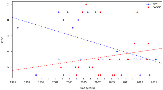 Trends in FIGO stage at diagnosis, as a function of the year of detection, are reported in Figure 2 in relation to the specific histotype. According to the multivariate regression analysis, the year of diagnosis was a significant predictor of FIGO stage for the clear cell histotype (p = 0.02) while it was not for the EAEOC histotype (p = 0.32; slopes difference: p = 0.02).