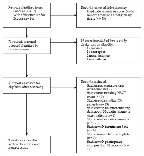 In the past 5 years, two meta-analyses have been made about LUS evaluation among connective tissue disease (CTD) patients [9,10]. Both studies found that LUSs using B-lines criteria had high diagnostic accuracy and correlated well with HRCT findings, therefore playing an important part in assessing ILD in CTD [9,10]. One analysis also evaluated the optimal number of lung intercostal space (LIS) points to be reviewed in one examination to make a high-accuracy assessment, the number per exam being 14 LIS points [10]. However, no evaluation was made on solely SSc patients, with all previous meta-analyses including all CTD patients. Therefore, the aim of this study is to evaluate the overall advantages of LUS examination using HRCT as a reference standard in assessing the presence and severity of ILD in SSc patients and assess the current criteria used in LUS examination.
