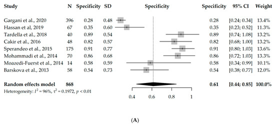 Forest plots for univariate random-effects meta-analyses showing (A) specificity and (B) sensitivity of LUS, based on eight studies that used B-lines as a criterion for ILD diagnosis [17,18,19,20,21,22,23,24].