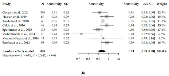 Nine studies had available information on TP, TN, FP, and FN and could enter the meta-analysis, with a total of 888 participants. However, since eight studies used B-lines as a criterion for ILD diagnosis [17,18,19,20,21,22,23,24] and one study used pleural irregularity [16], a meta-analysis without the one study using pleural irregularity was performed in order to assess the diagnostic accuracy of LUS (with a total of 868 participants). Due to the significant heterogeneity between the studies (I2 = 96% and 63%, respectively), first, a univariate random-effects model was used, and the overall specificity and sensitivity were 0.61 (95% CI 0.44–0.85) and 0.93 (95% CI 0.89–0.98), respectively. Interestingly, the results were not substantially different, even when the one study using pleural irregularity was added into the meta-analysis (specificity = 0.64, sensitivity = 0.94). Forest plots depicting the random-effects meta-analyses of diagnostic accuracy are depicted in Figure 2.