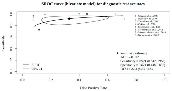 Taking into account that the specificity and sensitivity of a diagnostic test are mutually dependent, we additionally performed a bivariate meta-analysis, and the SROC curve is depicted in Figure 3. The AUC value of the SROC curve was 0.912 (and 0.917 in consideration of all nine studies), which indicates high sensitivity and a low false-positive rate for the majority of the included studies.