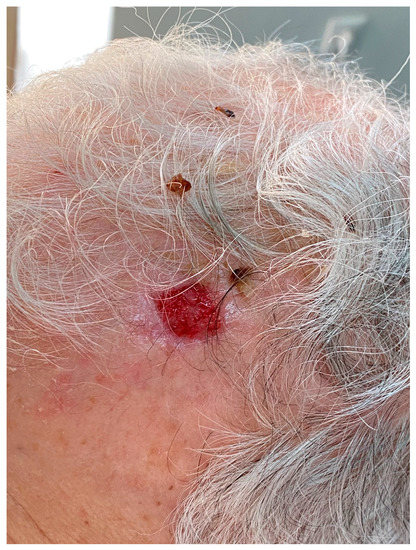 - Gerber, P.A.; Schulte, K.W.; Ruzicka, T.; Bruch-Gerharz, D. Eccrine porocarcinoma of the head: An important differential diagnosis in the elderly patient. Dermatology 2008, 216, 229–233. [Google Scholar] [CrossRef]