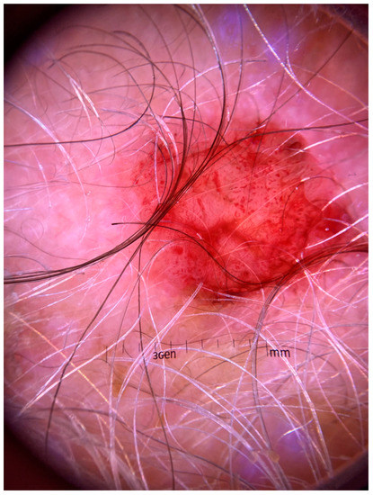 - Pinheiro, R.; Oliveira, A.; Mendes-Bastos, P. Dermoscopic and reflectance confocal microscopic presentation of relapsing eccrine porocarcinoma. J. Am. Acad. Dermatol. 2017, 76, S73–S75. [Google Scholar] [CrossRef]