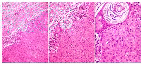 Duct formation constitutes another significant indicator for the diagnosis of EPC and differentiation from SCC. Histopathological studies have shown that the majority of cases exhibit mature ducts, characterized by cuboidal epithelial cells with an eosinophilic cuticle, even though poorly differentiated EPCs may only show less-developed ducts, which should not be overlooked [15,37]. Further histopathological findings that have been observed in EPC cases are the comedonecrosis; i.e., tumor cells containing central necrosis with an inflammatory reaction similar to a comedone, and a bowenoid pattern, characterized by pleomorphic cells and some multinucleated monster cells (Figure 3) [33,37].