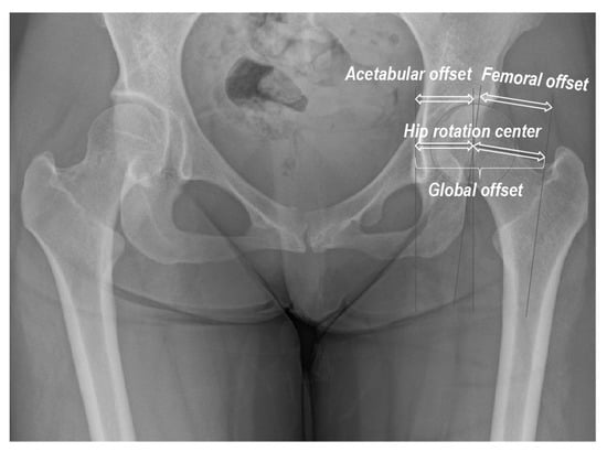 - Takamatsu, T.; Shishido, T.; Takahashi, Y.; Masaoka, T.; Tateiwa, T.; Kubo, K.; Endo, K.; Aoki, M.; Yamamoto, K. Radiographic Determination of Hip Rotation Center and Femoral Offset in Japanese Adults: A Preliminary Investigation Toward the Preoperative Implications in Total Hip Arthroplasty. Biomed. Res. Int. 2015, 2015, 610763. [Google Scholar] [CrossRef]