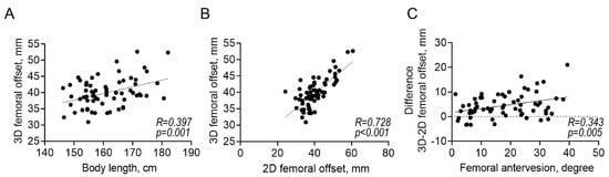 Shimizu, T.; Takahashi, D.; Ishizu, H.; Yokota, S.; Hasebe, Y.; Uetsuki, K.; Iwasaki, N. Anatomical and Simulation Studies Based on Three-Dimensional-Computed Tomography Image Reconstruction of Femoral Offset. Diagnostics 2023, 13, 1434. https://doi.org/10.3390/diagnostics13081434