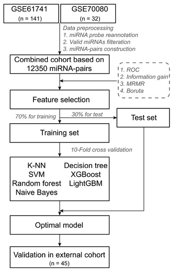 Other three feature selection algorithms, including information gain, maximum relevancy minimum redundancy (MRMR), and Boruta, were used before building our machine learning models. Briefly, information gain can pick the most informative and significant features based on the entropy values of features [19]. MRMR is a supervised feature selection model that identifies factors maximum relevant to the target classes along with maximally mutual to other features [20]. Boruta utilizes a statistical significance test to eliminate features with less importance values than that of shadow features [21]. The top 20 variables were selected from both information gain and maximum relevancy minimum redundancy methods. miRNA pairs that met the Boruta screening criteria were also selected. After that, the intersected miRNA pairs from the four feature selection methods were finally identified as key variables and further used as input for modeling.