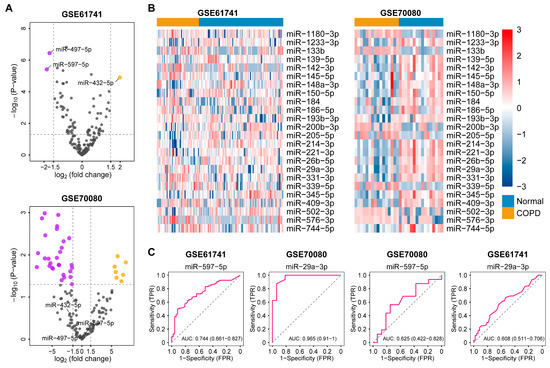 Comparison of the miRNA expression patterns and evaluation of the diagnostic value of miRNAs in two discovery datasets. (A) Volcano plots of DEmiRs (|log2FC| > 1.5 and p-value < 0.05) in samples from COPD and healthy controls in the GSE61741 and GSE70080 datasets. The yellow dots represent significantly up-regulated miRNAs in COPD, while the purple dots correspond to down-regulated miRNAs; (B) Heatmaps of the expression patterns of DEmiRs with a less stringent range (p-value < 0.05) between COPD and healthy controls in the two cohorts. Normalized expression values were scaled to the range of −3 to 3; (C) Receiver operating characteristic (ROC) curves measuring the performance of two representative miRNAs for predicting COPD and normal controls in the two datasets.