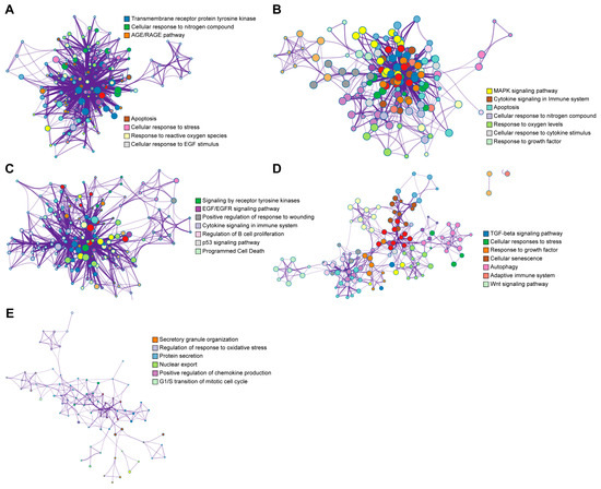 Functional annotations of the five miRNA pairs in the model. (A–E) Network of signaling pathways and biological processes enriched in the target genes of miRNA pair 1–5. Similar enriched terms are close to each other and connected by edges.