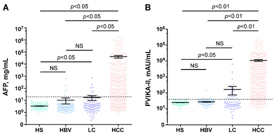 Serum AFP and PIVKA-II concentrations in different populations. (A) Serum AFP levels in healthy subjects (HS), chronic HBV infections (HBV), HBV-associate liver cirrhosis (LC), and patients with HBV-related HCC. (B) Serum PIVKA-II levels in healthy subjects (HS), chronic HBV infection (HBV), HBV-associated liver cirrhosis (LC), and patients with HBV-related HCC. AFP reference line: 20 ng/mL and PIVKA-II reference line: 40 mAU/mL.