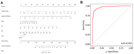 The occurrence and development of HCC involves a multi-step evolutionary process from the molecular to the clinical level, characterized by marked abnormalities in liver function, including liver enzymes, metabolism, and protein synthesis function [38]. Emerging evidence suggests that the imbalance of tumor and blood coagulation disorders promotes tumor growth, invasion, and metastasis [39,40]. For example, prolonged prothrombin time (PT) has been associated with aggressive tumor growth and poor survival rates in various cancers, such as lung cancer [39], kidney cancer [41], and early HCC [40]. After performing univariate and multivariate logistic regression analyses, we identified PT as one of the independent risk factors for HCC (OR = 0.839, p = 0.002). In addition, hypoproteinemia, especially hypoalbuminemia, suggests poor nutritional status and decreased hepatic synthesis function due to chronic liver disease and HCC [27,30]. According to our study, TP was also an independent risk factor for HCC (OR = 0.912, p < 0.001).