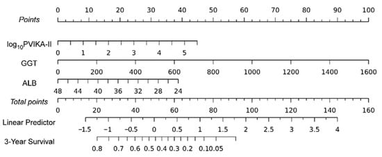The prognostic nomogram was established based on the risk factors PIVKA-II, GGT, and ALB, which were identified by the multivariate analysis. Higher levels of PIVKA-II and GGT and lower levels of ALB during hospitalization were associated with a poorer prognosis for HCC patients. The nomogram based on PIVKA-II, GGT, and ALB was referred to as the PGA grade (Figure 3).