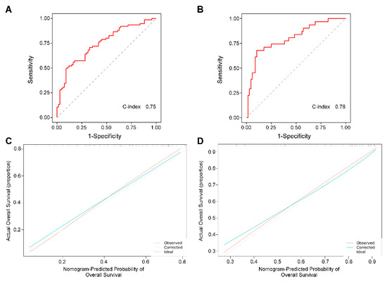 The C-index of the nomogram for the prognostic prediction of OS in the training cohort (A) and validation cohort (B). The calibration curves of OS based on nomogram prediction and the actual observation in the training cohort (C) and validation cohort (D).
