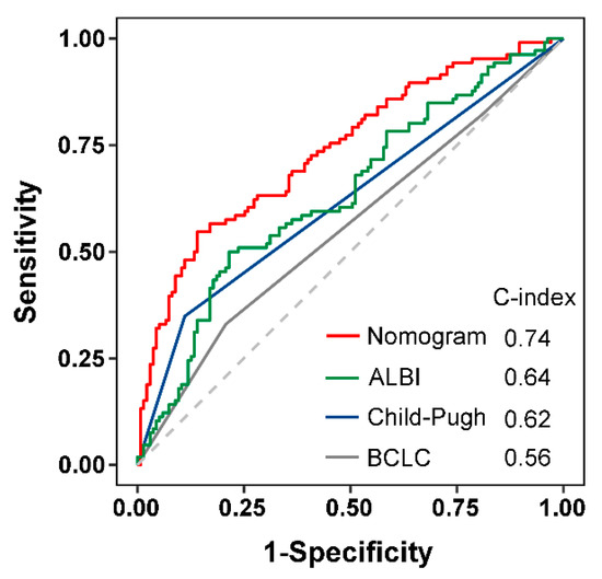 Child−Pugh grade, ALBI score, and BCLC were utilized to predict the prognosis of HCC. To further evaluate the clinical value of the PGA grade, we compared the performance of the predictive potential of 3-year survival probability in Child−Pugh grade, ALBI score, BCLC, and PGA grade in all follow-up cases. The C-index for OS prediction of the PGA grade was 0.74 (95% CI 0.68–0.80), which was found to be superior to that of the Child−Pugh grade (0.62), ALBI score (0.64), and BCLC (0.56). The result suggests that the PGA grade has better predictive potential than the ALBI score, Child−Pugh grade, and BCLC (Figure 5).