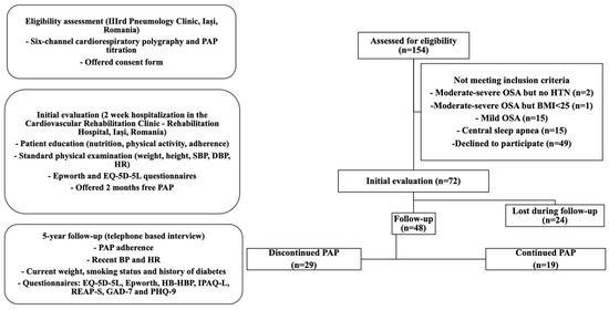 After OSA diagnosis, all subjects were evaluated in the Cardiovascular Rehabilitation Clinic (Rehabilitation Hospital, Iași, Romania) from January to December 2018. The patients underwent standard physical examination and completed the Epworth and EQ-5D-5L questionnaires. All patients were educated regarding the importance of a healthy lifestyle (nutrition and physical activity) and the need of daily PAP use and received free PAP therapy for 2 months (DreamStation Auto CPAP–Philips Respironics, REMstar Auto C-Flex CPAP–Philips Respironics or AirSense 10 AutoSet CPAP–ResMed). Data regarding our cohort, study protocol and preliminary (2 month) results have been previously published [33,34,35,36,37].