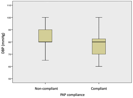 While the PAP-adherent patients presented a significant decrease in weight and BMI (Figure 4 and Figure 5), the nonadherent patients exhibited a tendency toward weight gain that did not reach statistical significance (p > 0.05) (Table 2). The HR increased in PAP-nonadherent patients (Table 2). While the DBP decreased in patients who continued to use PAP (Figure 6, Table 2), both the SBP and DBP increased in those who discontinued the positive airway treatment (Table 2).