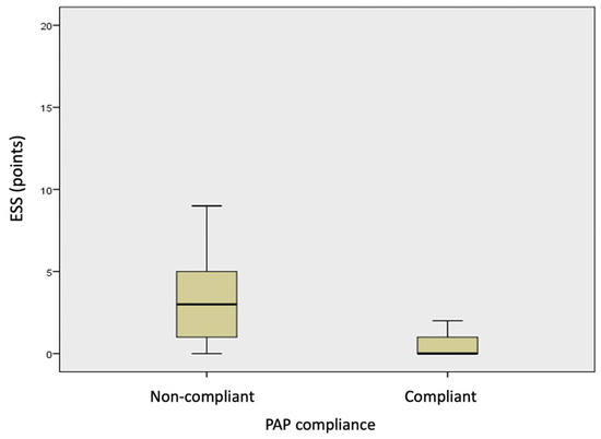 The presence of daytime sleepiness is a predictor of severe apnea and of a higher clinical benefit with PAP use [56]. The baseline median ESS scores in our OSA patients were within the “normal” range which could also explain the poor long-term PAP adherence and the lack of association between apnea severity, age and BMI with long-term PAP use. However, in line with previous studies [10,27,53,57], the ESS scores significantly decreased after PAP therapy, especially in the adherent patients. As Epworth scores are correlated with BMI [58], this effect can be partly attributed to the weight changes observed in the PAP-compliant subgroup.