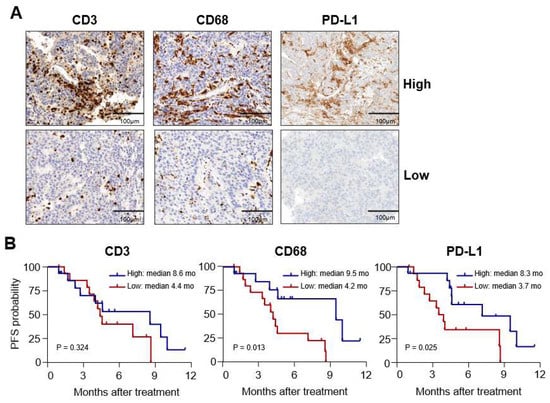 To further investigate the association between the expression levels of CD3, CD68, and PD-L1 within tumor tissues and patient outcomes, we divided the patient population into subgroups based on the median values of respective markers, as shown in Table 1. Representative immunohistochemistry findings are presented in Figure 1A. We found that there was no significant difference in OS between subgroups for each marker (data not shown). However, when we compared PFS, we observed that the high CD3+ subgroup did not have a significantly different PFS period compared to the low CD3+ subgroup (p = 0.32; Figure 1B, left). In contrast, the high CD68+ subgroup had significantly better PFS than the low CD68+ subgroup (median 9.5 months versus 4.2 months, p = 0.01; Figure 1B, middle). Similarly, the high PD-L1 subgroup also demonstrated a better PFS period than the low PD-L1 subgroup (median 8.3 months versus 3.7 months, p = 0.02; Figure 1B right).