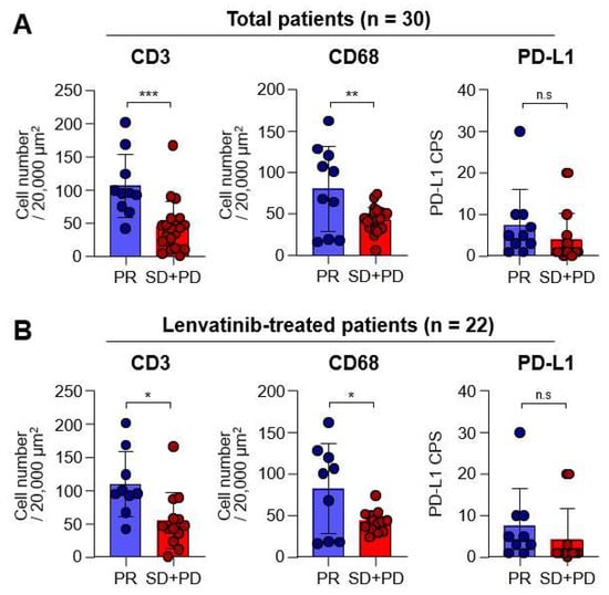 Differences in the expression of each marker according to the best responses. Graph showing the objective response rates of total (n = 30) and lenvatinib (n = 22) groups. (A) Graphs showing the CD3+ and CD68+ cell numbers, as well as the programmed cell death-ligand-1 (PD-L1) combined positive score (CPS) in total patients with partial response (PR; n = 10) and stable disease (SD) plus progressive diseases (PD; n = 20) in the total group. (B) Graphs showing the CD3+ and CD68+ cell numbers, as well as PD-L1 CPS, in lenvatinib-treated patients with PR (n = 9) and SD plus PD (n = 13). n.s., not significant; * p < 0.05; ** p < 0.01; *** p < 0.001.
