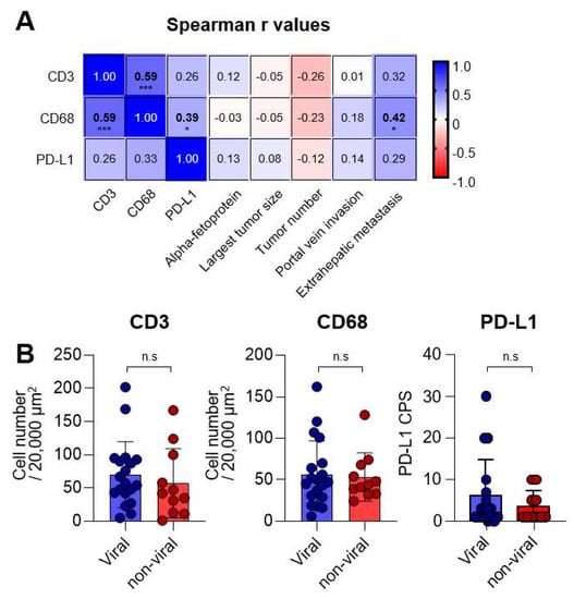 Correlations between CD3, CD68, programmed cell death-ligand-1 (PD-L1), and clinical parameters. (A) Matrix presenting the Spearman r values between each immunologic and clinical parameter. (B) Graphs showing the CD3+ and CD68+ cell numbers, as well as PD-L1 CPS, in MKI-treated patients with viral (n = 19) and non-viral (n = 11) etiologies. n.s., not significant; * p < 0.05; *** p < 0.001.