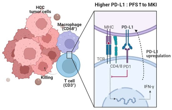 Previous studies characterized HCC subtypes as “immunocompetent”, “immunosuppressive”, and “immunodeficient” [13,14]. The first subtype is characterized by a robust infiltration of T cells (CTLs and Th1 cells) and TAMs, with an M1-dominant phenotype. CD68 is a glycoprotein predominantly expressed in macrophages, which aids in recognizing targets by attaching to specific lectins or selectins in tissues or organs. As a universal macrophage marker, CD68 allows for the detection of all macrophage types, irrespective of their phenotype. M1 macrophages exhibit anticancer and proinflammatory properties, whereas M2 macrophages are linked to cancer-promoting and immune-suppressing effects [15]. TAMs express PD-L1, which reflects the immunogenic nature of the tumor. This phenotype is expected to respond well to ICI therapies. In the second subtype, immunosuppressive cells, including TAMs, are highly infiltrated, while T-cell infiltration is low. TAMs may express PD-L1 but at a lower level than that seen in cells with an immunocompetent phenotype. This phenotype may not respond well to immune checkpoint inhibitor therapies and may require combination treatments. The third subtype is referred to as the “immunodeficient” subtype. The infiltration of T cells and TAMs is poor, possibly due to poor tumor immunogenicity. This subtype may not respond to immune-based therapy unless antigen release by the locoregional or systemic therapies results in local inflammation sufficient to cause immune cell infiltration. Furthermore, whether these different subtypes influence the response of MKIs is unknown.