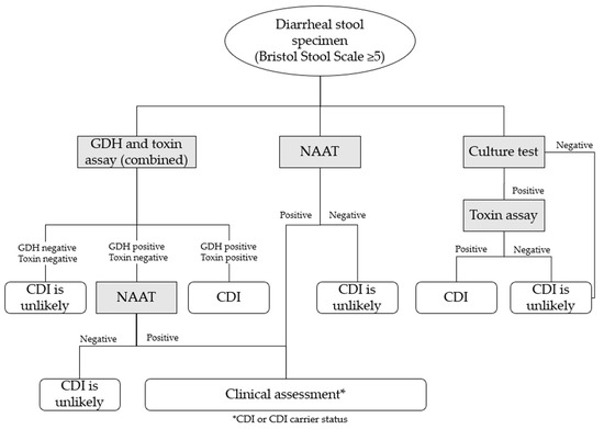 - Kraft, C.S.; Parrott, J.S.; Cornish, N.E.; Rubinstein, M.L.; Weissfeld, A.S.; McNult, P.; Nachamkin, I.; Humphries, R.M.; Kirn, T.J.; Dien Bard, J.; et al. A Laboratory Medicine Best Practices Systematic Review and Meta-analysis of Nucleic Acid Amplification Tests (NAATs) and Algorithms Including NAATs for the Diagnosis of Clostridioides (Clostridium) difficile in Adults. Clin. Microbiol. Rev. 2019, 32, e00032-00018. [Google Scholar] [CrossRef] [PubMed]