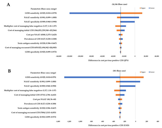One-way sensitivity analysis for difference in cost per CDI diagnosed in the NAAT alone pathway compared to the two-step algorithm in (A) JPY; (B) USD. Data parameters that are the most sensitive to changes in the base case estimate are listed in descending order. A value below 0 would represent cost savings when the NAAT alone pathway is used compared to the two-step algorithm. CDI: Clostridioides difficile infection; GDH: glutamate dehydrogenase; JPY: Japanese yen; NAAT: Nucleic Acid Amplification Test; USD: United States dollar.