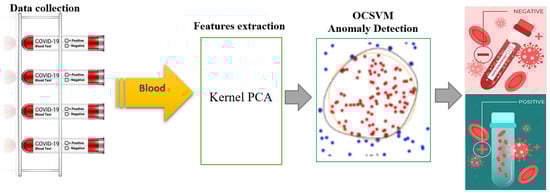 The proposed KPCA-OCSVM method for identifying COVID-19 infections from blood test data involves training the model using only non-infected samples to extract features. This is done through the use of the KPCA algorithm, which is designed to learn and accurately describe non-infected blood test data and produce relevant features to aid in the training process of the OCSVM algorithm. The OCSVM is then employed to detect infected cases in the testing dataset, which includes both infected and non-infected observations. The features extracted by the KPCA are used as input for the OCSVM, which is sensitive to outliers in the training set (Figure 1). The OCSVM’s objective function is responsible for determining the presence of a COVID-19 infection. The training phase of this approach has a time complexity of O(), and the testing phase has a time complexity of O(), where n is the number of samples.
