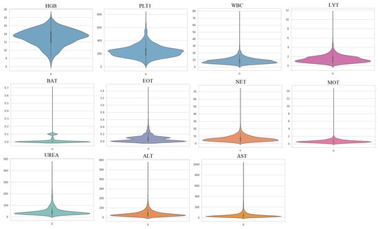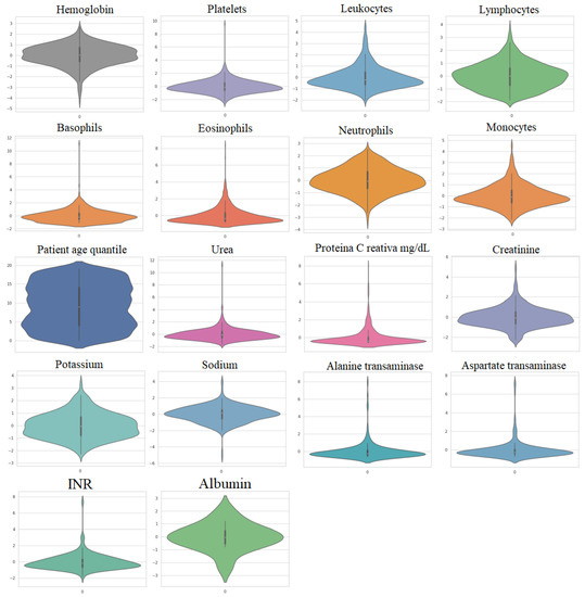 The first dataset, referred to as Dataset 1, was gathered from 5644 patients at the Albert Einstein Hospital in São Paulo, Brazil, with 559 of them being COVID-19-positive patients, according to [39]. More details about this dataset can be found in [16,39,40]. Figure 2 illustrates the violin plots of the important 18 features and it can be observed that these datasets do not follow a Gaussian distribution.