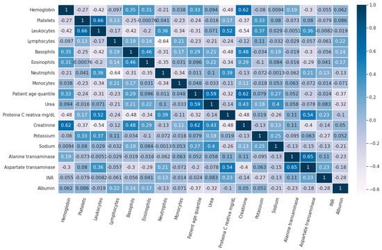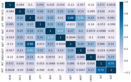 The feature importance identification results align with the existing literature on COVID-19. Studies have reported that COVID-19 patients often exhibit lymphopenia, liver and muscle damage, and elevated C-reactive protein (CRP) levels [44,45,46]. Additionally, various studies have reported common abnormalities in COVID-19 patients, such as increased AST, decreased lymphocyte count, increased white blood cell count (WBC), and increased ALT [18,47].