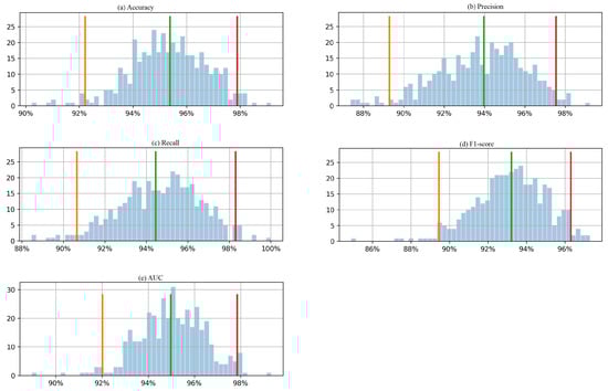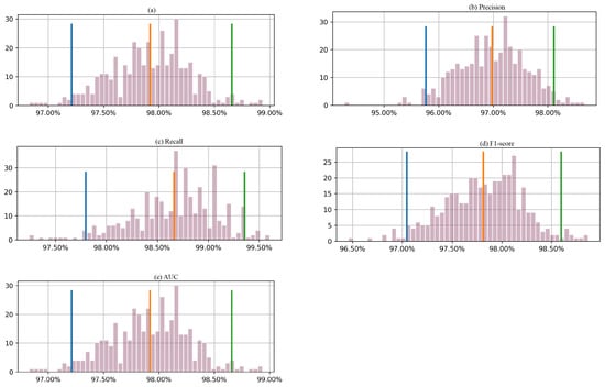 Histogram of 400 bootstrapped outcomes with a 95% confidence interval for each evaluation metric (a) accuracy, (b) precision, (c) recall, (d) F1-score, and (e) AUC, calculated from the testing Dataset 2.