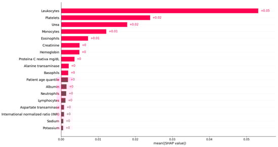 Figure 8 shows the bar plot of the mean absolute SHAP values for each variable based on Dataset 1. From Figure 8, we can observe that the most important feature for detecting COVID-19 infection in Dataset 1 is ‘Leukocytes’. Indeed, ‘Leukocytes’ are white blood cells that play a crucial role in the body’s immune system response, so it is not unexpected that they are essential in predicting COVID-19. ‘Platelets’ is identified as the second most important variable in detecting COVID-19 infection, as shown in Figure 8. Platelets are blood cells that are crucial in clotting and wound healing. The significance of these variables in predicting COVID-19 is not surprising, as leukocytes are essential in the body’s immune response, and platelets are necessary for clotting and wound healing, both of which play a crucial role in combating viral infections [1]. The next identified most important features are ‘Urea’, ‘Monocytes’, and ‘Eosinophils’, respectively. ‘Urea’ is a waste product filtered by the kidneys, and abnormal levels can indicate kidney dysfunction or dehydration. Additionally, ‘Monocytes’ and ‘Eosinophils’ are types of white blood cells that are involved in the body’s immune response to viral infections, indicating the importance of the immune system in COVID-19. Monocytes are white blood cells that play an important role in the immune system’s response to infections, including viral infections such as COVID-19 [15]. The identification result suggests that changes in monocyte levels or functions may be significant in determining whether a person is infected with the virus. On the other hand, eosinophils play a role in the body’s response to parasitic infections, allergic reactions, and inflammation [43]. In COVID-19, the virus can trigger an overactive immune response called a cytokine storm, leading to inflammation and tissue damage, especially in the lungs [15]. Although ‘Creatinine’, ‘Hemoglobin’, and ‘proteina C reativa’ have relatively low importance in detecting COVID-19 infection compared to the other variables, they still may play a role in the disease and warrant further investigation. ‘Creatinine’ is another waste product that is filtered by the kidneys and can indicate kidney dysfunction or dehydration. ‘Hemoglobin’ is a protein found in red blood cells that carries oxygen throughout the body, and low levels can indicate anemia, which may be a complication of severe COVID-19. ‘Proteina C reativa’ is a marker of inflammation in the body and can be elevated in COVID-19 patients. The remaining features with low importance may still be useful in predicting COVID-19; they may not be as strongly associated with the disease as the other features listed above. Further research into the relationship between these variables and COVID-19 can provide additional insights into the mechanisms of the disease and potentially guide treatment decisions. Overall, by analyzing the most important variables for predicting COVID-19 infection using XGBoost and SHAP values, we could obtain a better understanding of how the virus affects the body and can identify potential targets for treatment.