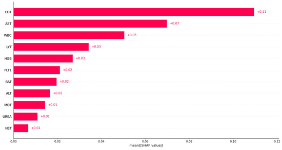 Similarly, we investigated feature importance based on Dataset 2; Figure 9 displays the bar plot of the mean absolute SHAP values. Based on Dataset 2, the eosinophil count was identified as the most important variable in predicting COVID-19. This indicates that the eosinophil count may play a significant role in distinguishing between COVID-19 patients and non-COVID-19 patients in that dataset. From Figure 9, we can see that aspartate aminotransferase (AST), white blood cells (WBC), and lymphocyte count (LYT) were also identified as important variables in predicting COVID-19. This suggests that these variables may also play a role in discriminating between COVID-19 patients and non-COVID-19 patients in that dataset. However, the exact impact of these variables on predicting COVID-19 may vary in different datasets or models, and additional research may be needed to fully understand their relationships with COVID-19. A full analysis of the importance of blood sample variables in detecting COVID-19 infection is beyond the scope of the current paper.