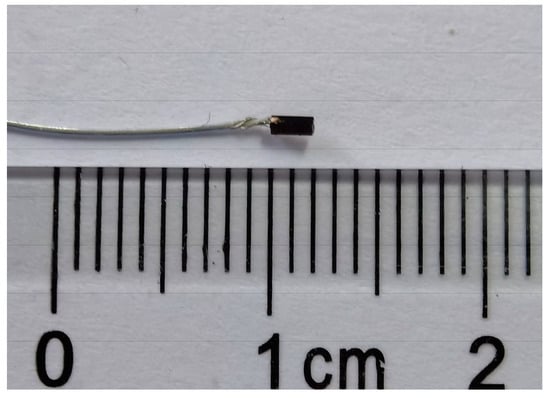 A small high-frequency transducer was designed and fabricated for the mechanical scanning imaging system, as shown in Figure 2. Considering the mounting fixation and imaging performance, the transducer size was designed to be 2.0 × 0.7 mm with a center frequency of 12 MHz. This operating frequency ensures that the transducer has both high imaging resolution (~150 μm) and deep imaging depth (~20 mm) to enable the detection of deeper blood vessels under the skin. The transducer consists of a 130 μm PZT piezoelectric layer, a 0.9 mm silver epoxy backing layer, and a thin matching layer. The detailed fabrication process can be found in our previous publications [20,21]. The transducer was connected to the system using a 42 AWG coaxial cable.