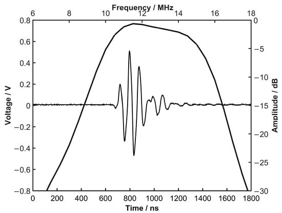 The pulse echo of the fabricated high-frequency transducer was measured with a DPR500 pulser–receiver (JSR Ultrasonics, Pittsford, NY, USA). A flat Ackley plastic plate placed 5 mm away from the transducer was used as the reflective target. In Figure 3, the black line is the detected pulse–echo waveform, and the blue line is the calculated frequency spectrum by performing a Fourier transform on the echo data. According to the results, the fabricated transducer has a center frequency of 12.6 MHz, a bandwidth @−6 dB of 48.2%, and a peak-to-peak value of 984 mV, meeting the requirements of high-frequency mechanical scanning ultrasound imaging.