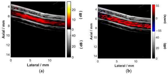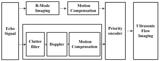 The processing flow of the ultrasonic imaging system is shown in Figure 6. After the ultrasonic echo signals were filtered by clutter filtering, the pulsed-wave Doppler blood flow signals were extracted; finally, the blood flow images were overlaid on the B-mode images by color coding to form the ultrasonic blood flow imaging. Both the B-mode images and the blood flow imaging images were motion compensated to achieve correct imaging, and the specific analysis can be seen in the motion compensation chapter. Due to the fact that the blood flow information received by the system contains not only blood flow signals but also clutter signals (mainly generated by the motion of the vessel wall and its surrounding tissues) and system noise signals, in order to obtain a high signal-to-noise ratio of the blood flow signals, clutter filtering of the echo signals must be performed first. Considering the filtering effect and measurement speed, the regression polynomial based on the least squares method was used for filtering the main component of the blood flow signal in the area of blood flow, and the clutter filter based on the Hankel singular value decomposition was used for filtering the clutter in the non-bloodstream areas [22,23]. After filtering, the echo signals were used to extract the blood flow parameters such as signal magnitude, velocity, and direction of the blood flow by the pulsed-wave Doppler principle and the autocorrelation algorithm [24]. Combined with the relative scanning speed of the transducer, the blood flow information was motion compensated accordingly. Finally, the ultrasonic blood flow imaging was completed by a priority encoder and combined with the B-mode images.