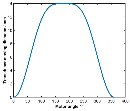 Since the mechanical scanning of the system is not in uniform motion, the displacement distance at each moment is different when the stepping motor rotates in one round. According to the transmission structure, the relationship between the horizontal movement distance of the transducer and the rotation angle of the motor (obtained by the encoder) was calculated as shown in Figure 7. The motion trajectory as a whole presents a sinusoidal change, and its motion in the middle region is approximately linear, but at its top it has a significant hysteresis in the range of motor angles from 152° to 208°, which is mainly caused by the mechanical scanning method of the connecting rod drive. This nonlinear motion will result in errors in imaging target distortion and blood flow velocity. Therefore, motion compensation for its high-precision imaging is essential.