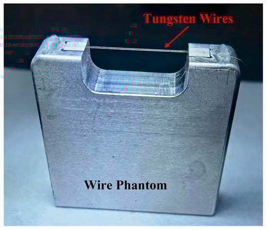 Wire phantoms were primarily used to test the B-mode imaging resolution of the developed system. The wire target mimicry consisted of two tungsten wires with a diameter of 10 μm and a spacing of 500 μm, as shown in Figure 9. The two tungsten wires were bonded to a 4 cm long stainless steel base for easy movement and use. When testing, the wire phantom was placed 8–10 mm away from the transducer to simulate superficial imaging.