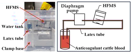 The flow phantom is mainly used to test the blood flow imaging performance of development systems. The hemodynamic parameters of the radial artery near the radius were referred to in the flow phantom experiment [25]: blood vessel diameter 2.07 ± 0.32 mm, wall thickness 0.39 ± 0.08 mm, systolic peak flow rate 51 ± 15 cm/s, and blood vessel depth less than 10 mm. Figure 10 shows the built flow phantom and test device. Among them, anticoagulant cattle blood was selected as imitation blood, and a latex tube with a diameter of 2 mm and a wall thickness of 0.5 mm was used as a blood vessel imitation. The latex tube was held in place by a custom 3D-printed scaffold, and the angle of detection was adjusted by controlling the scaffold and system probe. According to the detection needs, the angle between the blood vessel imitation and the system HFMS was set as 10° and the distance was about 5 mm.