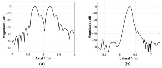 The full width at half maximum (FWHM) of the envelope signals of the wire was taken as a characterization parameter for system lateral and axial imaging resolution, as shown in Figure 12 below. According to evaluation of the line spread function based on Rayleigh Criterion [26,27], the lateral and axial resolutions of the system are 140 μm and 168 μm, respectively.