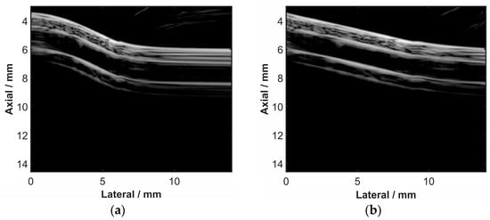 First, the system was used to perform B-mode imaging of the vessel phantom, as shown in Figure 13. It can be seen that the non-motion-compensated image (Figure 13a) is significantly distorted in the regions at both ends of the image compared with the motion-compensated image (Figure 13b). As expected, imaging with motion compensation can effectively improve the imaging accuracy of the target structure and the accuracy of subsequent measurements.